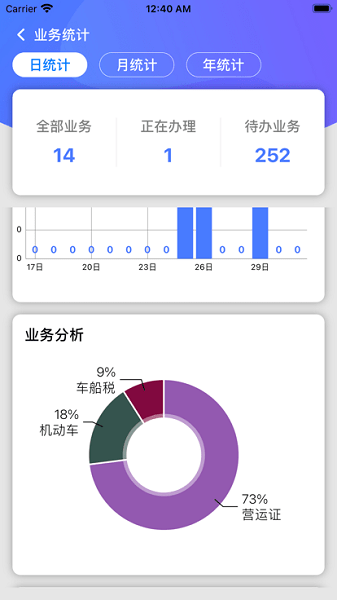 车辆统计、业务统计、费用统计、线下安全培训、员工信息等