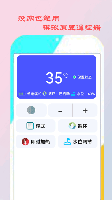 智能空调遥控家电工具把空调、电视、机顶盒遥控器统统装进手机!安装即可遥控空调/电视/投影仪/音响/风扇/热水器等日常家电,安装包内置离线遥控器码库,没有网络也能遥控家电!模拟空调原装遥控器,除了可以遥控空调制冷/制热,调温度之外,还支持调睡眠、超强、清新、节能、除湿等模式,以及定时开关等。
