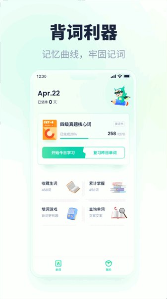 建立记单词目标,可每日打卡,我们一起来养成好习惯,见证您的蜕变。