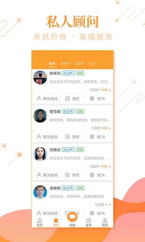 这里有你人生中的必交之友,律师、翻译、财务、医生、教师等,遇到问题,轻松咨询或简单发布,就能获得到一对一的贴心服务。