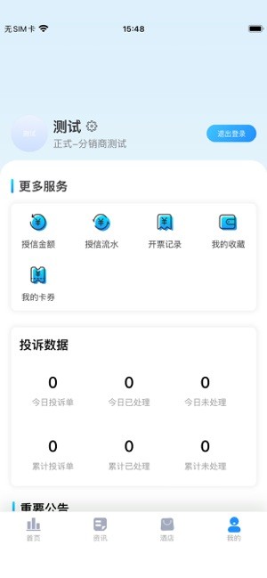 授信金额、授信流水、开票记录、我的收藏、我的卡券等服务,投诉数据、重要公告信息查看