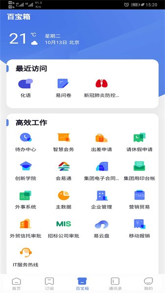根据官方介绍,“化小易”是E.A.S.Y.项目的成果,重点在于提升员工的工作效率和办公体验。软件里有很多实用的功能,比如公文审批、请休假申请、出差申请、领导日程管理等等,还支持智慧商旅预定机票酒店,甚至可以阅读电子报刊。通讯录功能也很强大,能快速查找同事的联系方式。