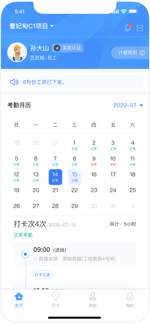 人员进出场线上审批监管,面部自动检索,道闸机同步更新,有效监管施工工地人员进出,一键生成整个过程考勤表,兼容全国各地考勤管理标准,一键生成工资条,服务平台代付款员工工资,提高企业资金效率。