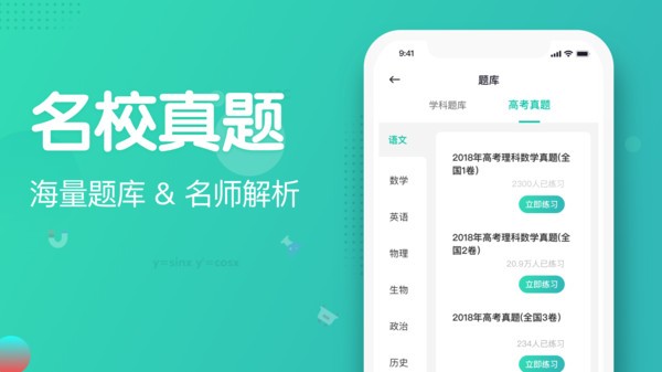 收录100000+道海量知识题库,在线练习,精准提分,更有百套历年高考真题以供考生随时模拟训练。