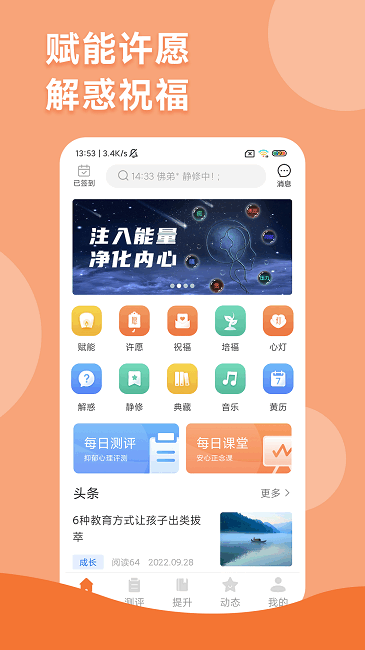 智慧人生APP是深圳市功德文化有限公司旗下一款含有资讯、手机在线答疑、许愿、静修、培福、测评、学习、社交于一体的互联网个人成长学习提升软件。