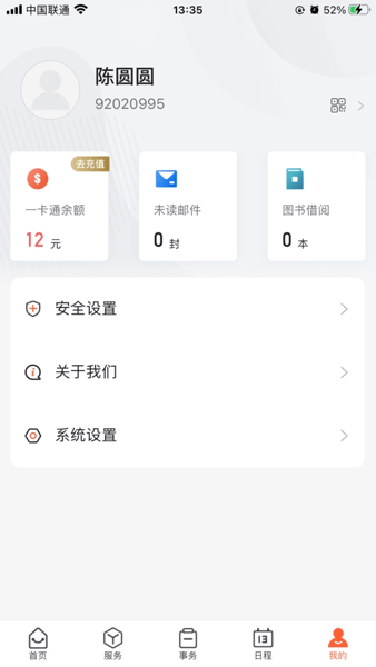一卡通余额、未读邮件、图书借阅、安全设置、系统设置等