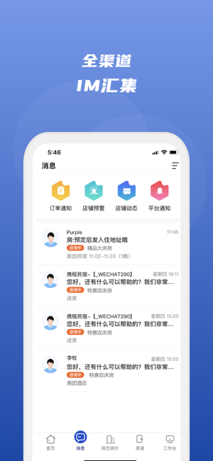 2、渠道智能管理:IM汇集/智能回复、智能价格、智能房态/库存、中央房源数据库等智能化应用以及常用操作自动化设计,提高运营效率节省人力成本;