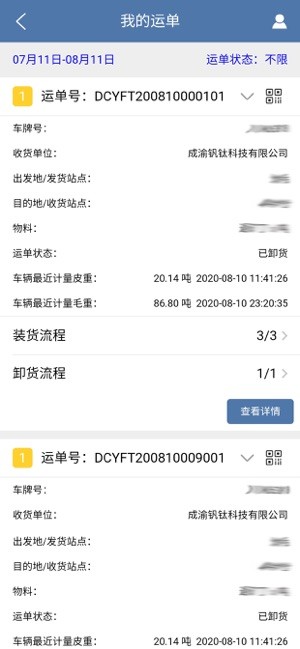 APP为司机用户提供服务,可接收和查询来自川威运吧平台的运输任务,并查看运单执行流程;在办理计量和发货、收货环节时,向业务人员或相关设备出示运单二维码。