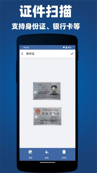 【证件扫描】支持身份证、名片等常见证件的一键扫描。智能识别证件边缘,还可自行调整选取区域,一键编辑图片,轻松导出为图片、PDF。