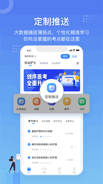创序医考是创序医药职业学校旗下打造的一款智能移动医学备考平台,作为一站式医学考试服务平台,创序医考涵盖护理、医学、药学、医技、规培、事业编制、健康管理师等所有正高、副高、中级、初级考试职称考试上千个医学考试,满足千亿级医学考试需求。平台内海量严选考题超1500万道,精编考点120余万条,2000张高清医学图谱,9500种药物,4000种检验方法,独家智能记忆推送法则,定制化推送学习,帮助考生精准应对各类医学考试,真正实现医考定制,用创序。