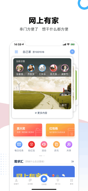 云家园:顾名思义,就是网上的家。网上有家,串门方便了想做什么都方便。当然不是交友聊天这点事。 串门有社交但更重生活,相信总能帮到你。
