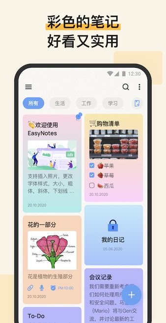 有了这个好的笔记应用程序,您可以轻松地做笔记,查看笔记并检查笔记状态。可以按时间顺序做排列。支持不同的展示方式:列表模式或网格模式。您也可以将最重要的笔记固定在顶部。