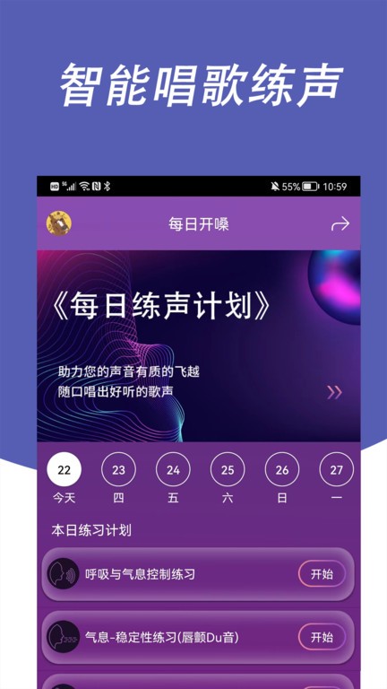 每日开嗓 App 可以帮助您进行唱歌练声的训练,在练声的过程中,系统根据您的声带特性,进行系统的练习与矫正,达到您理想的发声状态,从而令您在唱歌时气息稳定,音质饱满,音调准确,音色动听。