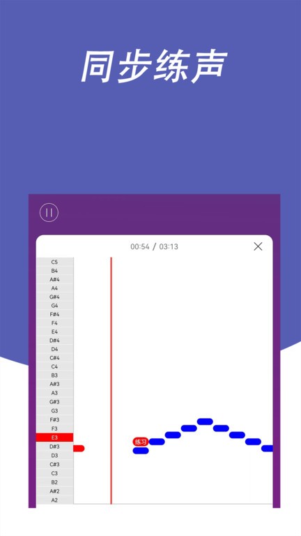 App 提供练声时动态的音阶图,用户可以直观看到曲线中练习声调,通过音阶图,实时进行练习,当发音不准时,可以通过 App 中的曲线,及时的发现音准偏离标准音,进行发音的调整。