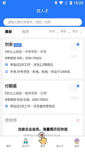 吉鹿力app是为企业招聘者和求职者提供的线上找工作平台,集找工作、找人才、招聘会、企业库功能为一体,可以随时发布简历、发布职位。最新岗位招聘实时更新,智能推荐,在线筛选,及时交流沟通,帮助大家解决求职招聘的问题!