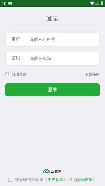 云收单商家版是给商户提供一个收银与统计的app,收银员通过app扫码/二维码可进行微信或支付宝收款,app集合通知与统计以及查询的功能。此app不对外开发,没有注册功能,只提供给我们线下推广与合作的商户使用。目标人群:有固定店面并且已开通支付收款的商户。