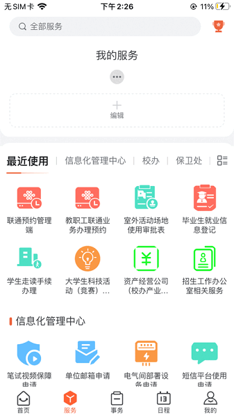 1、在线办事,这里提供了庞大的在线办事板块,让用户可以申请各种业务,奖学金等。