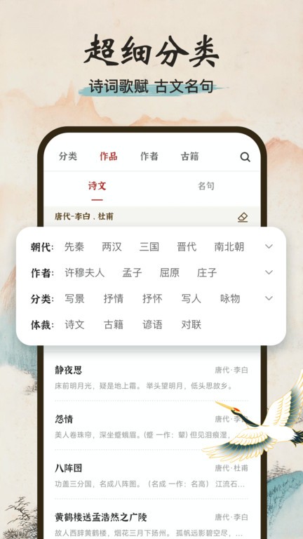 【诗词文库】五千年中华文化,100万诗词文库,按朝代、作者、作品分类搜索,涵盖注释、译文和赏析。
