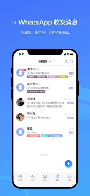 适用于出差期间异动办公,随时随地处理客户WhatsApp消息;支持19种语言翻译,让您与各国客户无限畅聊;即便账号被封,依然可以查看历史客户消息。