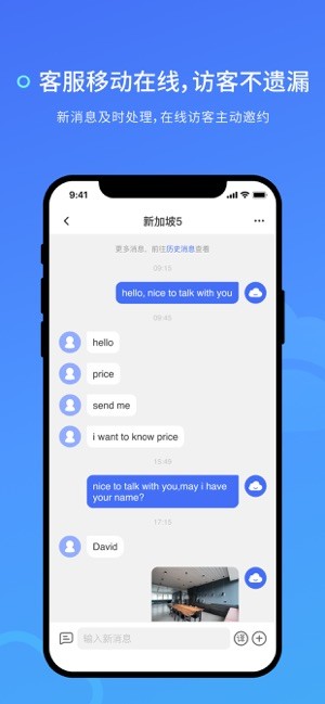 新消息实时提醒,确保消息不遗漏;在线访客主动邀约,掌握先机;快速识别老客户,一键查看访问记录和 CRM 客户信息。