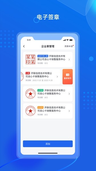 印章在线制作,支持企业公章、财务章、合同章、法人章等各类印章和个人签名的在线设置,使用记录全程追溯。