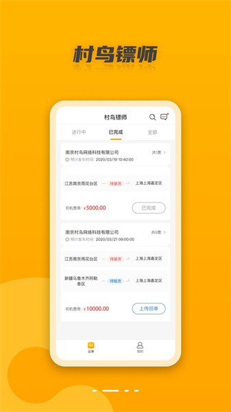 村鸟镖师app,一款专门为广大的货车司机们打造的在线办公软件,平台上有大量的订单等待着大家来处理,司机用户可以根据自己的需求在线接单,进行运货服务,所有操作直接在手机端进行即可,超级的方便好用,极大的方便司机们的日常工作,有需要的朋友快来下载用起来啊~