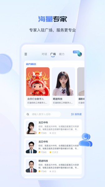 工作数字人最新版是一款智能ai数字机器人app,功能比较强大,数字人自主学习回答,答你所问,还支持房间互动,对外交流,自由添加个性化能力赋能数字人,更有海量专家入驻广场,服务更专业,有效辅助办公,提高工作的效率!