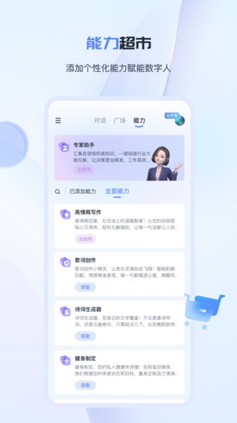 能力超市中,根据你的行业特征为你提供海量的能力服务,如写作、绘图、视频创作、行业报告、职业成长、工作管理等,绑定能力赋能你的数字人。
