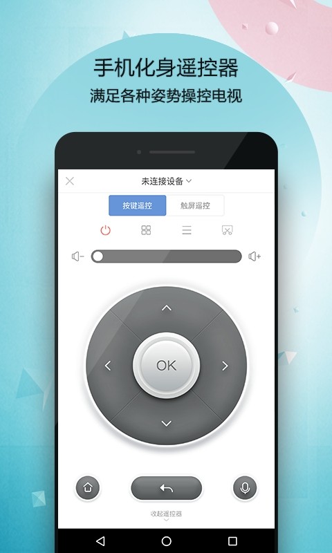 可兼容电视端所有遥控器功能与应用控制,目前拥有“按键模式”和“手势模式”两种遥控面板,可使用遥控面板进行9i看点App以及电视端其他应用的界面操作。另外,当电视端播放视频过程中,手机关闭屏幕,再点亮时同样会出现遥控器面板。