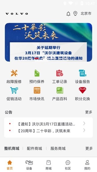 沃尔沃建筑设备最新版是提供工程机械行业建筑设备服务的平台,支持故障报修、预约保养、工单记录、设备报告、促销活动、市场快讯、产品百科、积分兑换功能,最新通知公告消息及时推送,轻松了解,还提供掌上商城产品推荐,掌上社区服务不容错过!