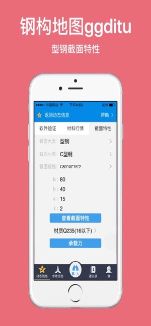 钢构地图app是钢构地图网站配套的手机APP,可以利用它生成钢构地图网站中钢结构软件的验证码,有些简单的常用的软件功能,比如截面特性及基本承载力也可以在APP实现,当然,钢结构行业相关的资讯及技术资料会在“动态信息”频道中推送,还有钢结构相关的主材价格行情可以根据日期查询。