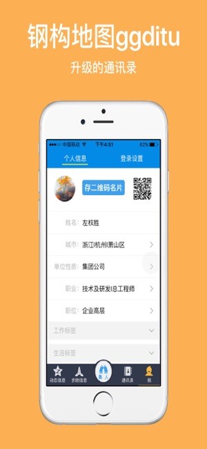 软件还支持生成验证码功能,方便用户进行身份验证。此外,该应用充分利用手机通讯录,让用户完善个人信息并形成电子名片,通过二维码分享和管理人脉关系。用户还能在“动态信息”频道获取行业资讯和技术资料推送,以及钢结构相关的主材价格查询。