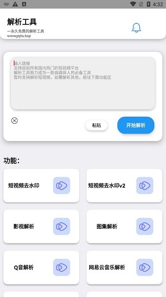 解析工具app是一款功能强大的链接解析下载的应用工具,界面清爽简单,布局清晰,体积小巧,操作轻松易上手,支持短视频去水印、影视解析、网易云音乐解析、图集解析、文字转音频等功能,大家可以根据需要自由选择,十分方便,值得推荐!