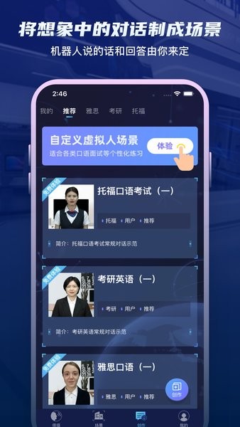 App里还有创作模块,可以用来模拟考试,临场感很强。练习的时候还可以打分和纠正发音,这点很实用,能让我知道自己哪里需要改进。自由对话功能也很棒,随时可以和虚拟人聊天,话题广泛,像朋友一样交流,不会觉得尴尬。