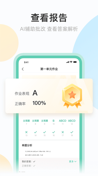 -- 老师还可获取到班级每位学生的作业数据报告,从而更细致地了解到不同学生的学习情况,让精准教学更有依据。