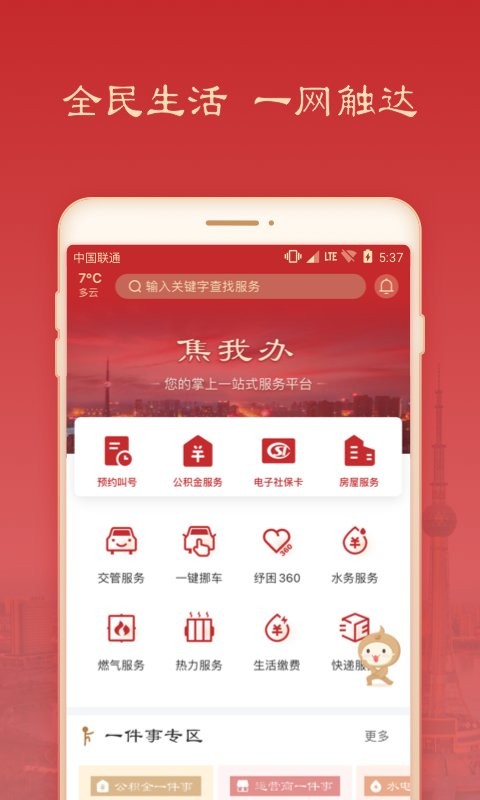 政务大厅预约叫号、水气暖报装、公积金提取。