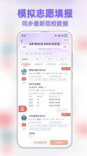 关键数据同步显示,快捷填报学校、专业到我的志愿表,还可一键查看学校和专业信息,了解我喜欢的院校,报考定位更准确!