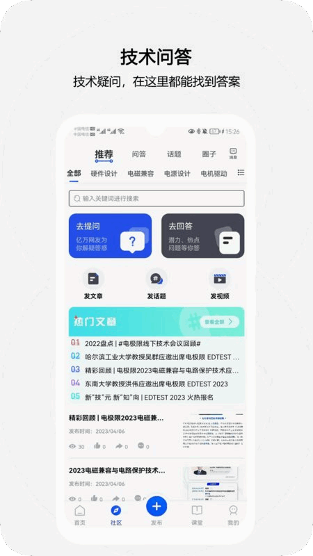 电极限最新版是为从事电子技术工程行业的人员提供的教育学习平台,带来在线课堂、技术问答、资料下载、硬件设计、电磁兼容等服务,提供热门直播,技术圈子、预约实验室等功能,打造掌上社区交流环境,利用碎片化时间学习查看,解答疑惑!