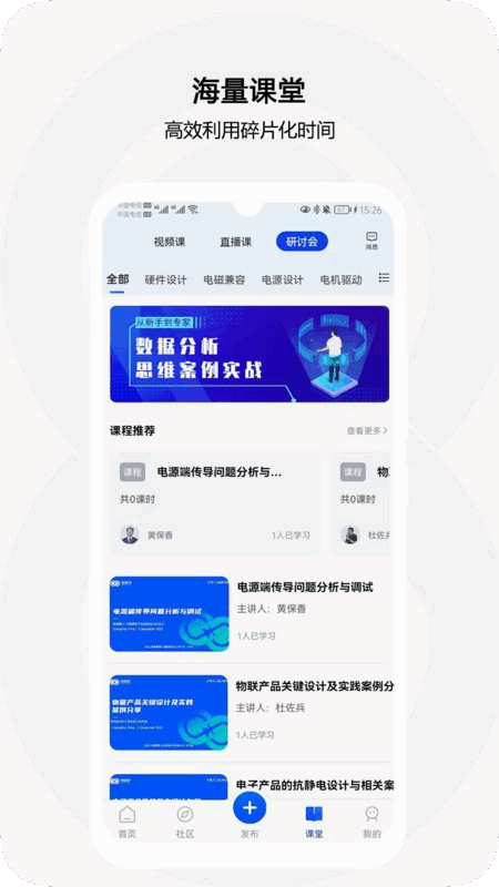电极限App是电极限官方开发的一款支持电极限云服务在线学习和资源管理的移动应用,为电子工程师提供视频学习矩阵,提供丰富的技术在线学习课程、大咖直播分享、技术大会、等海量内容,同时支持电子行业标准下载、专家在线解答、在线问答等功能,帮助您随时随地、更迅速、更高效地进行资源管理与学习。