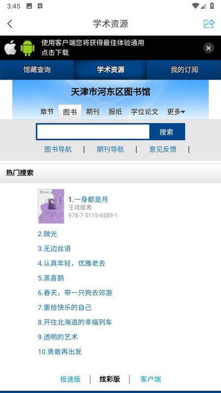 1、一站式学术资源检索及获取,拥有超过百万册电子图书、海量报纸文章及中外文献元数据、数万集视频公开课等,为用户提供方便快捷的移动学习服务。