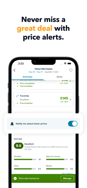 有一次旅行即将到来,想尝试以便宜的价格预订住宿吗?现在,您可以在trivago应用程序上注册价格下跌警报,以了解您喜爱的酒店的价格变化。你不会一直搜索,而是会在价格下跌时立即收到通知,这样你就可以迅速行动,获得一笔不错的交易。