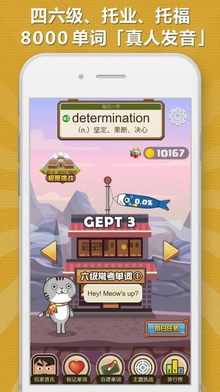 超级单字王最新版是一款专为英语学习者设计的单词挑战应用,结合游戏化学习模式,让记单词变得轻松有趣。软件涵盖四六级、托业、托福等考试的核心词汇,真人发音标准清晰。它提供了问答、拼词、听力等多种玩法,并支持自建词库和标记功能,方便用户针对性复习不熟悉的单词。此外,还有丰富的主题挑战和极限挑战模式,帮助提升英语能力。应用内还加入了趣味猫咪小助手陪你一起闯关,学习过程更添乐趣。软件的亮点还包括排行榜系统,让学习更有动力。超级单字王不仅适合备考的学生,也适合日常英语爱好者使用。我个人觉得这款应用挺不错的,通过游戏的方式记忆单词既高效又有趣,真人发音也很标准,特别是对于需要准备考试的人来说是个不错的选择!