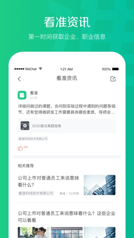 看准软件看准,Boss直聘兄弟APP,帮你提升求职技能,找到高薪工作!每年超过1亿用户使用看准找工作!搜索内部员工真实爆料,搜历年面试真题,还有HR帮你修改简历,让你不被骗、不被坑、不被套路!无论你是正在找份工作的应届生,还是准备跳槽的老鸟,看准都能帮你顺利通过面试,找到满意的工作!