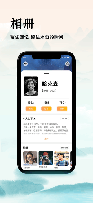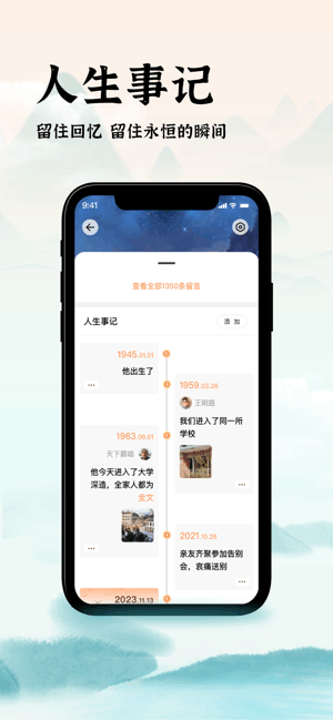-- 人生事记:用户还可添加逝者相关人生事记,缅怀逝者,留存纪念