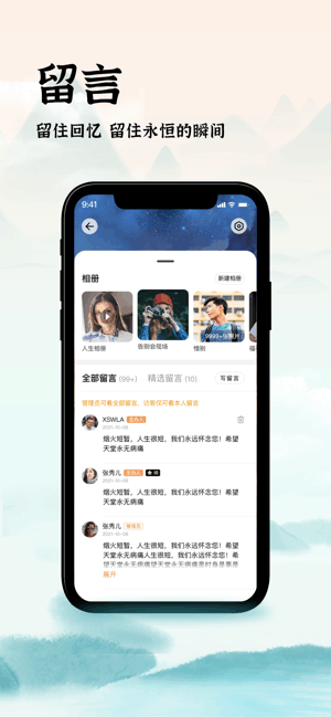 -- 留言和精选留言:用户可对逝者进行留言怀念,访客用户留言仅自己可见,管理员可查看所有,并可删除用户留言;管理员可设置精选留言,所有用户均可见;