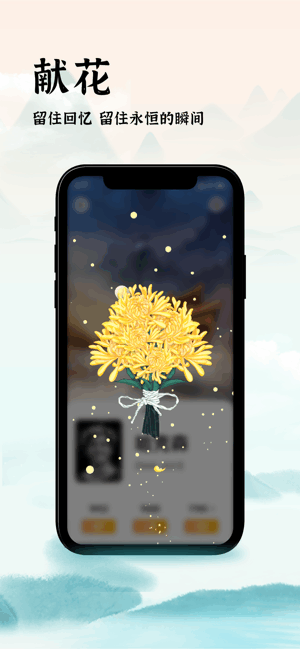 -- 献花:用户可点击献花,为逝者献上一束花以表哀思,可分享该页面到社交平台