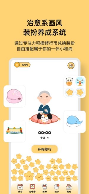 -- 治愈系装扮:利用专注时间积累修行币,换取多种装扮用来个性定制装扮首页小和尚。