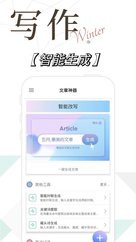 写作精灵手机版是提供写作服务的应用app,支持在线创作,输入关键词即可智能生成文章,还提供智能改写功能,一键快速纠错,省时又省心,更支持智能对联生成、关键词提取、藏头诗生成等服务,满足不同人的需求,写作更加高效!
