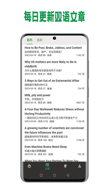 首先,它每天都会更新双语文章,既能看英文又可以对照中文理解,特别适合我这种还在打基础的学习者。查单词也特别方便,点一下生词就能马上看到解释,省去了来回切换工具的麻烦。