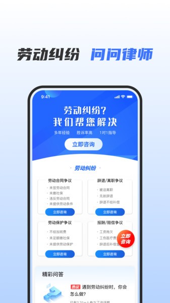 问问律师最新版是主要提供劳动纠纷方面的法律咨询服务,支持劳动合同争议、辞退/离职争议、劳动保护争议、报酬/赔偿争议等咨询,这里有专业、多年经验的律师为您服务,快速响应沟通,帮您解决劳动纠纷问题,一对一提供指导,还支持在线精彩问答,满足用户需求!